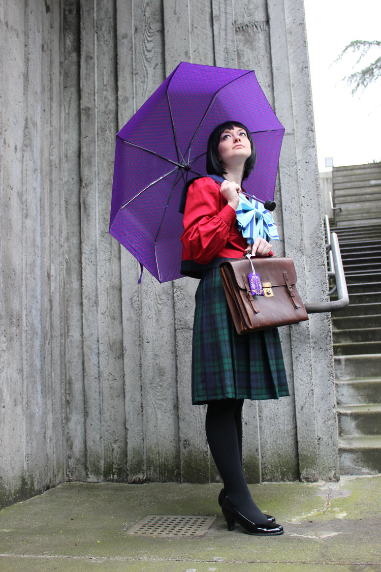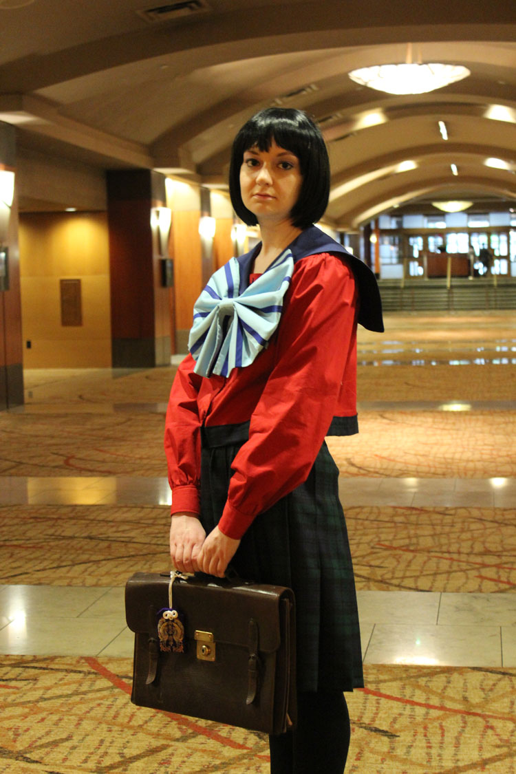 A big part of inspiration for this costume came from the amazing Japanese cosplayer Usako. She gave me the ideas to use Black Watch instead of just painting blue stripes on green fabric (I personally like the Black Watch better because it's more schoolgirly), the scale of the length of the blouse and size of the bow, and using blue bias tape on the bow (which is glued on using ultra-strength Heat 'n Bond).