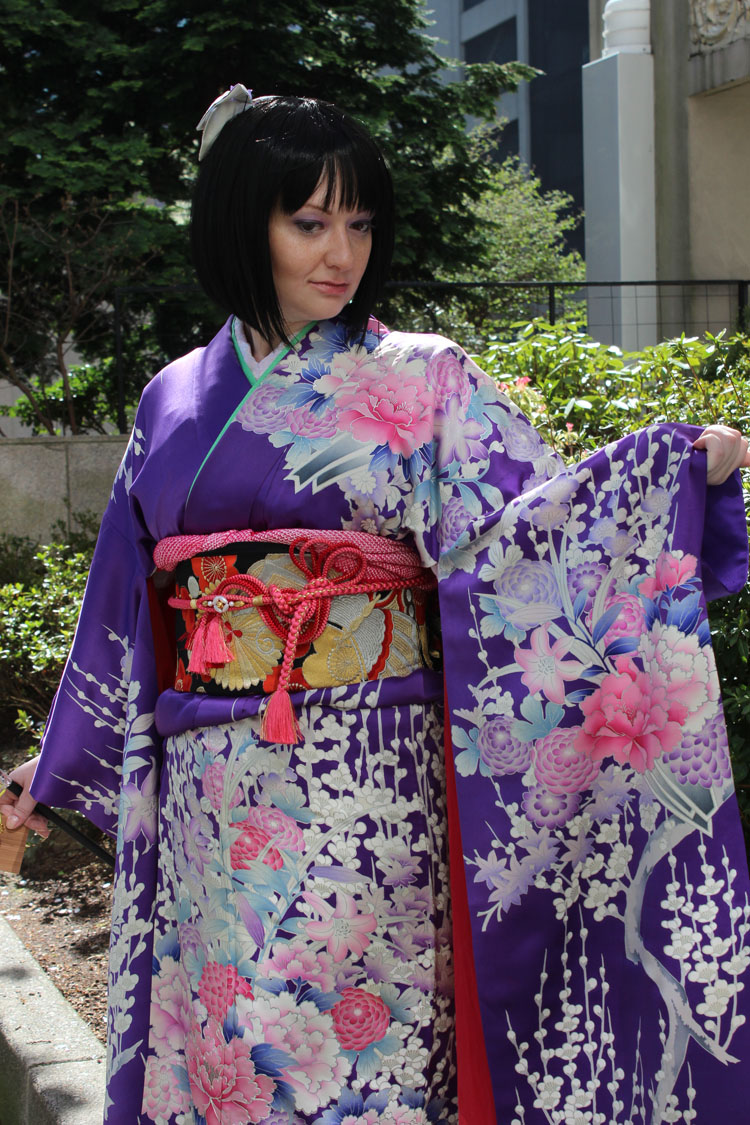 The furisode itself was an extremely lucky find on a website I frequent dealing in vintage kimono and everything that comes with them, Ichiroya. It was listed at an unbelievable discount due to a couple stains and a loosened seam under the right arm where the sleeve attaches, which was easily mendable. I'm not sure about the age of the piece, it could be mid or late Showa (1926-1989) or early Heisei (1989-present), but it is dazzling. It features uplifting yari-ume (upward-facing plum blossoms), branching from the hem all the way through the shoulders. Hana-noshi (flowers, including peony, chrysanthemum, lilies, wisteria, purple plum blossoms, and maple leaves, in folded paper) are dabbled about as well. It's a huge testament to the sheer attention to detail and painstaking process in which kimono are made; it is dyed using the yuzen technique, with each and every detail painstakingly traced in silver leaf. One peony on the front left panel is even traced in silver koma embroidery! And at the hem, the illusion of a shadow under the eda-ume is created with resist-dyeing. The furisode is also fully lined with white silk, which is consistent with a kimono made to be worn during winter.